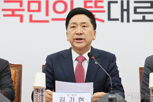김기현 국민의힘 대표가 23일 오전 서울 여의도 국회에서 열린 최고위원회의에서 발언을 하고 있다.