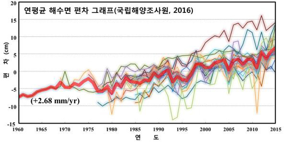 올해 발표한 우리나라 해수면 상승률은 IPCC가 발표한 전 세계 평균값 2.0mm/yr보다 다소 높으며 지역별로 상승률이 다소 차이를 보였다.