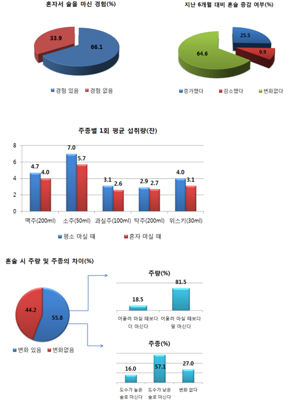 혼술 시에는 도수가 낮은 맥주를 주로 마셨고 혼술족의 약 40% 가량은 고위험음주량 이상을 마신 것으로 나타났다.