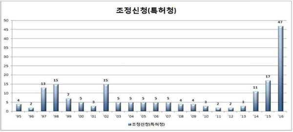 특허청 산업재산권 분쟁조정위원회는 지난 1995년 설립이후 올해 11월까지 총 182건의 산업재산권 분쟁을 접수·처리했고 2013년까지 평균 5건에 불과하던 신청건이 2014년 11건, 2015년 17건, 2016년 47건으로 급격하게 증가했다고 23일 밝혔다.