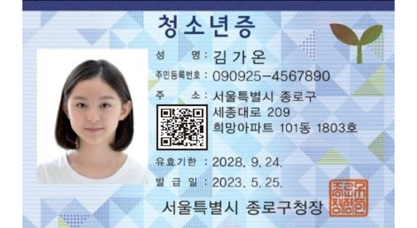 ▲ 청소년증 예시. (자료=여성가족부)9세 이상 18세 이하 청소년(또는 대리인)은 주소지와 관계없이 가까운 읍·면·동 행정복지센터에 방문해 청소년증을 발급 신청할 수 있으며, 발급 비용은 무료다.