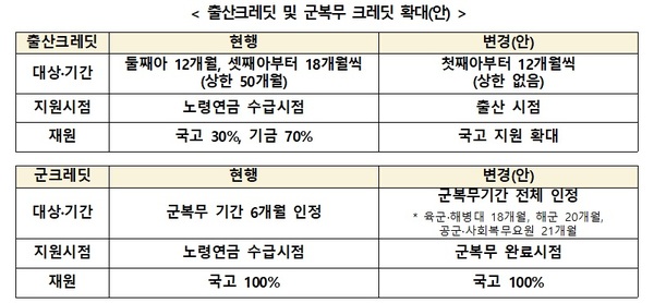 이 밖에도 출산 및 군복무에 대한 크레딧을 확대하는 등 인구 구조 변화에 맞춰 형평성을 강화하는 방안도 담겼다.