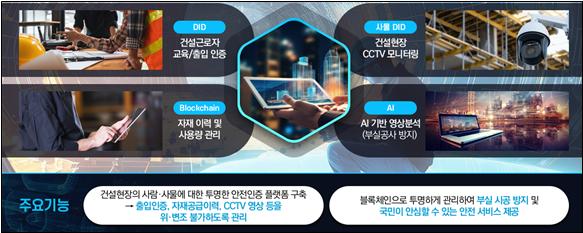 이 서비스는 조작이 불가능한 블록체인 기술을 기반으로, 증명된 현장인력 출입관리, 인증된 자재 이력관리, 폐쇄회로(CC)TV, 사물인터넷(IoT)센싱, 인공지능(AI) 등 통합관제 기술을 아파트 건설 현장에 적용해 투명한 공사관리가 이뤄지게 하는 서비스다. 최근 사회적으로 문제가 된 무량판 구조 아파트 철근 누락이나 건축자재 시험성적서 위‧변조 등으로 인한 부실시공 문제 해결을 위해 착안했다.