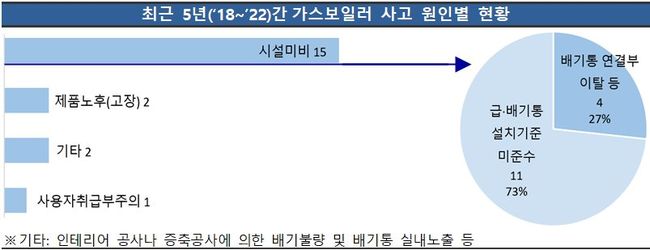 가스보일러 사고는 주택에서 가장 많이 발생하였으며, 주요 원인으로는 급·배기통 설치기준 미준수와 배기통 연결부 이탈 등의 시설미비가 15건으로 가장 많았고, 제품노후 2건, 사용자 취급부주의 등이 있다.