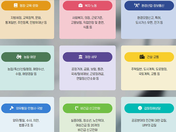 국민콜110의 특징이라면 행정·교육·문화, 복지·노동, 환경산업·정보통신, 농림·해양, 재정·세무, 건설·교통, 외무통일·민형사·국방 등 거의 모든 행정기관의 민원을 아우른다는 것이다.