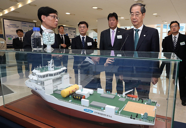 ▲ 한덕수 국무총리가 23일 서울 마포구 누리꿈스퀘어에서 열린 탄소중립녹색성장위원회 전체회의 참석 전 청정메탄올을 선박에 활용한 설계기술 모형을 살펴보고 있다. (ⓒ뉴스1)