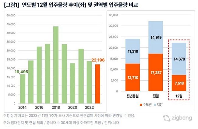 [일간환경연합 김경훈 기자] 직방 조사에 따르면 올해 12월은 총 2만2196세대가 입주한다. 이는 전월(3만 2,206세대) 대비 31%, 전년동월(2만 4,028세대) 대비 8% 가량 적으며, 12월 물량으로만 봤을때 2014년(1만 6,495세대)이후 가장 적은 물량이다.