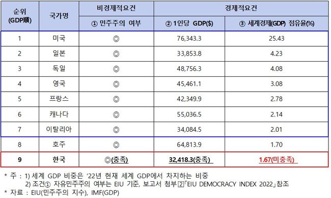 그러나 G7 경제력의 두 번째 요건인 ‘세계 GDP 비중 2%’는 충족하지 못하고 있다. 2022년 한국의 세계 GDP 비중은 1.67%로 자유민주주의‧고소득(1인당 GDP 3만불 이상) 국가들 중 G7과 호주(1.70%)에 이은 글로벌 9위에 위치한다.
