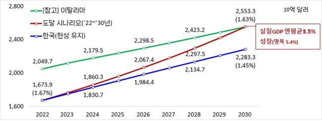 한경협에 따르면 2030년까지 한국의 경제력을 G7 수준으로 끌어올리기 위해서는 올해부터 연평균 3.5%의 경제성장률(실질)을 기록해야 하는 것으로 분석되었다. 이는 2022년 1조 6,739억 달러인 명목 GDP를 2030년까지 2조 5,533억 달러(이탈리아 수준)로 끌어올리는 시나리오에 근거한다.