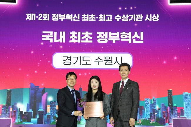 지난 24일 부산 벡스코에서 열린 제1 · 2회 정부혁신 최초 · 최고 수상기관 시상식에서 수원시 관계자가 수상하고 있다.