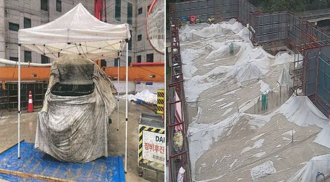 강우 시 현장조치 사례. 현장 펌프카 외부 천막 설치(왼쪽), 콘크리트 타설부위 비닐시트 설치(오른쪽)