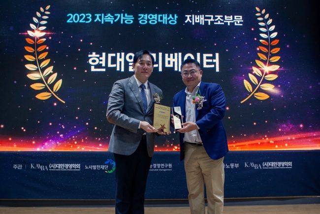현대엘리베이터가 1일 열린 2023 지속가능 경영대상에서 지배구조부문 대상을 수상했다. 이용운 현대엘리베이터 CSO(오른쪽)와 윤동열