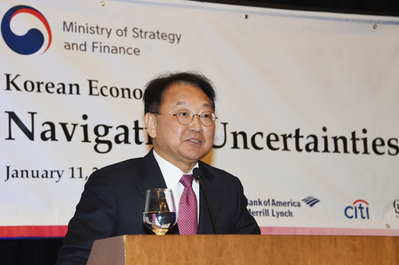 유일호 부총리 겸 기획재정부 장관이 11일 (현지시간) 미국 뉴욕 인터콘티낸탈 호텔에서 열린 뉴욕 한국경제설명회(IR) 에서 투자자 및 글로벌 금융회사 이코노미스트들에게 프리젠테이션을 하고 있다. <사진=기획재정부> |
