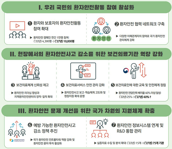 이에 환자 유관단체의 원활한 환자안전활동 수행을 위한 지원체계 마련 등 국가 차원의 교육·홍보 사업을 추진해 2022년에 4300명이 참여했던 환자안전 캠페인을 2027년에는 1만 명으로 끌어올린다.