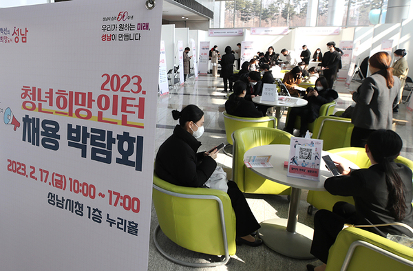▲ 2023 청년 희망 인턴 채용박람회를 찾은 인턴 지원자들이 면접 순서를 기다리고 있다. (ⓒ뉴스1) 올해는 공공기관의 경영여건 악화, 공공기관 혁신 등 어려운 여건 속에 청년인턴은 2만 1000명 채용이 예상되며 6개월 이상 인턴은 전년 대비 8.5배 증가한 8400여명으로 전망된다.