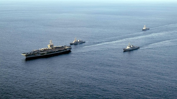 ▲ 한미 해군과 일본해상자위대가 지난달 26일 제주 동남방 공해상에서 북한의 핵·미사일 위협이 고도화되는 상황에서 한미일간의 긴밀한 공조와 작전수행능력 강화를 위한 해상훈련을 하고 있는 모습. 앞줄 왼쪽부터 미 해군 항공모함 칼빈슨함, 일본 해상자위대 구축함 키리사메함, 한국 해군 이지스구축함 세종대왕함, 미 해군 이지스구축함 키드함. (사진=미 해군)
