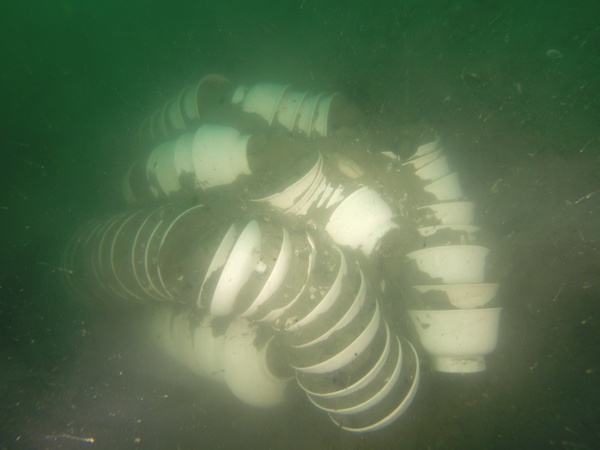 ▲ 지난 2014년 마도4호선에서 인양된 백자 다발 모습.(ⓒ뉴스1) 올해 발굴조사에서 확인한 길이 115㎝, 너비 31.5㎝, 높이 15㎝ 선체 조각은 방사성탄소연대측정 결과 11~12세기의 것으로 추정되며 연결부와 홈이 잘 남아있다.