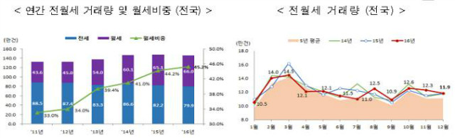 | 2016년 및 2016년 12월 지역별 전월세거래량 (단위: 건) |