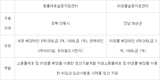 산업부는 올해부터 5년 간 1865억원을 들여 경북 안동시 동물세포실증지원센터, 전남 화순군 미생물실증지원센터등 대행기관 두 곳을 건립할 예정이다.