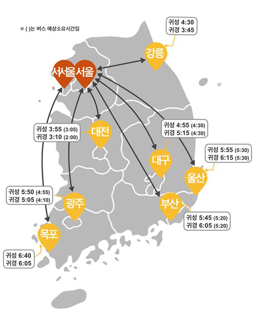 도시별 소요시간은 귀성의 경우 서울~부산 5시간 45분, 서울~광주 5시간 50분, 서서울~목포 6시간 40분, 서울~대전 3시간 55분, 서울~강릉 4시간 30분이 걸릴 것으로 보인다.