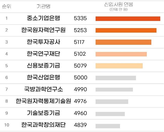 네 번째로 연봉 수준이 높았던 곳은 △한국연구재단(5,102만 원)였으며, 이어 △신용보증기금 (5,079만 원) △한국산업은행(5,000만 원) △국방과학연구소(4,990만 원) △한국원자력통제기술원 (4,976만 원) △기술보증기금(4,960만 원) △한국과학창의재단(4,839만 원) 순으로 조사됐다.