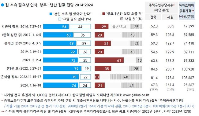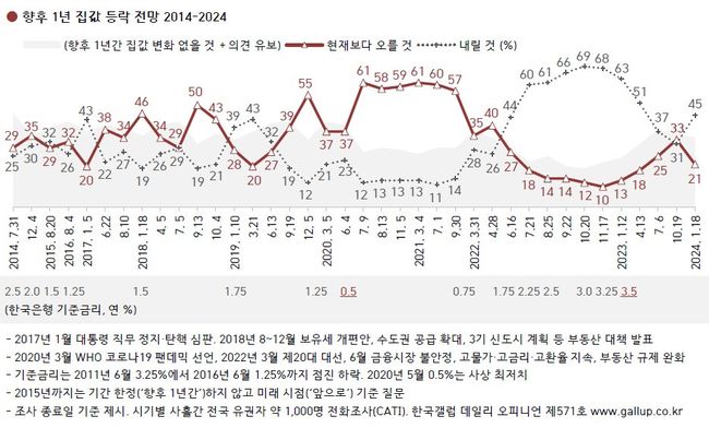한국갤럽이 2024년 1월 16~18일 전국 만 18세 이상 1,002명에게 향후 1년간 집값 전망을 물은 결과 21%가 `오를 것`이라고 답했다.
