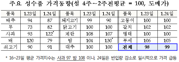 정부는 성수품 특별공급은 24일 기준으로 당초계획의 107% 수준이 방출되는 등 원활히 진행되고 있으며, 성수품 가격도 설 성수기 이전과 비슷한 수준을 유지하며 안정적인 모습이라고 평가했다.