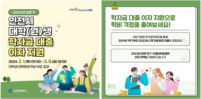 인천광역시는 ‘2024년 상반기 대학(원)생 학자금대출 이자지원 사업’ 참가자를 2월 1일부터 3월 8일까지 접수한다고 밝혔다.