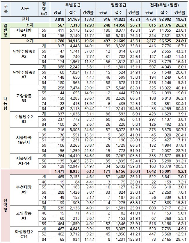 지역별로는 서울 위례 65.1대 1, 고양창릉(나눔) 40.1대 1, 서울 마곡 30.7대 1 등의 경쟁률을 기록하였으며, 특히 서울 위례 59㎡ 일반공급 159.8대 1, 서울대방 84㎡ 일반공급이 76.2대 1, 서울마곡 59㎡ 일반공급이 66.5대 1을 기록하며 높은 경쟁률을 보였다.