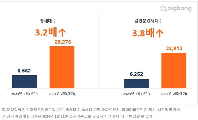 직방에 따르면, 2024년 2월 분양예정 물량은 38개 단지, 총 2만8276세대로 조사됐다. 일반분양 규모는 2만3912세대다. 전년 동월(8662세대) 대비 3.2배 많은 물량으로 지난 1월 공급실적(1만4581세대)보다 개선된 수치로 청약자를 맞을 예정이다.