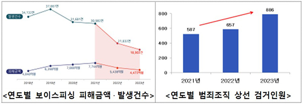 그러나 보이스피싱 범죄의 전체적인 감소 추세에도 불구하고 지난해 11월 이후 피해액이 크게 증가하고 있고, 투자리딩방 사기와 부고장 스미싱 등 신·변종 보이스피싱 사기도 최근 빠르게 확산되고 있다.
