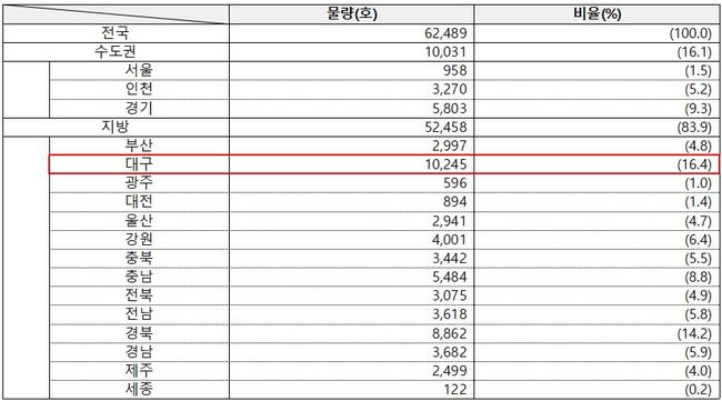 지역별로 보면, 대구(10,245호)가 가장 많았으며, 경북(8,862호), 경기(5,803호), 충남(5,484호), 강원(4,001호), 경남(3,682호), 전남(3,618호) 등 순으로 나타났다.