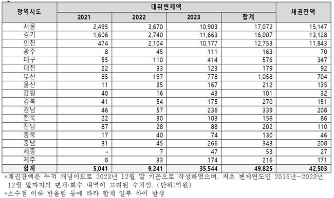 지역별로 살펴보면 최근 전세사기가 집중되었던 서울·경기·인천 지역에 대위변제액 역시 집중되었던 것으로 나타났다.