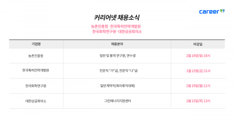 [일간환경연합 김경훈 기자] 커리어넷이 농촌진흥청, 한국특허전략개발원, 한국화학연구원, 대한상공회의소 등 채용 소식을 발표했다.