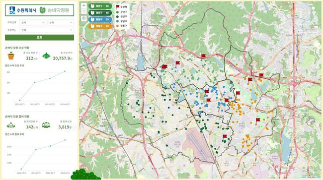 [일간환경연합 김경훈 기자] 수원시가 손바닥정원 관련 정보를 한눈에 볼 수 있는 ‘손바닥정원 온라인 지도’를 구축했다.