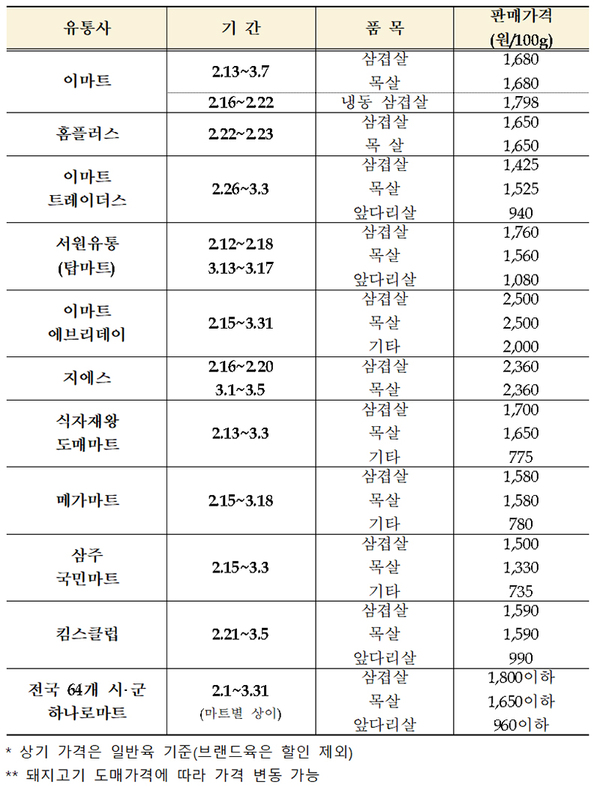 예를 들어 삼겹살은 지난해 2월 상순 소비자가격은 100g당 2428원이고 올해는 2308원인데, 이번 할인행사 혜택으로 최저 1425원에 삼겹살을 구매할 수 있게 된다.