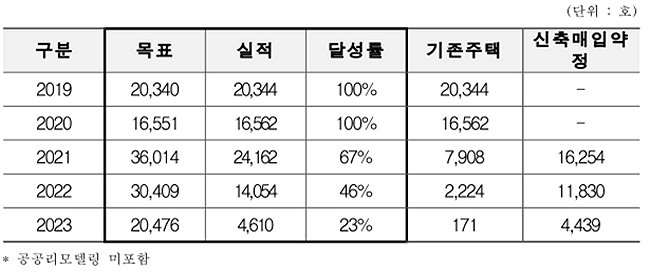 LH는 그동안 매입임대주택 공급목표를 설정하고, 매입 후 물량을 공급해왔으나 2019년(20,340호), 2020년(16,551호)은 당초 목표의 100%를 매입한 반면 2021년부터는 매입실적이 감소한 것으로 나타났다.