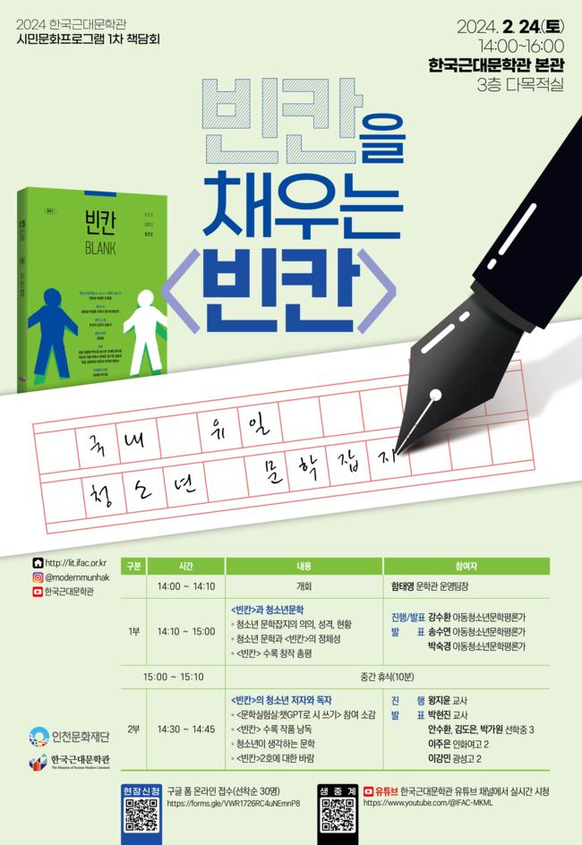 [일간환경연합 한선미 기자] 인천문화재단 한국근대문학관이 2024년 1차 책담회 "빈칸을 채우는 <빈칸>"을 개최한다. 「빈칸」은 인천문화재단 한국근대문학관이 지난해 11월에 발행한 국내 유일 청소년 문학잡지이다. 아동청소년문학평론가, 중‧고등학교 교사, 청소년 저자 및 독자 등이 참여하는 이번 행사는 2월 24일(토) 오후 2시 한국근대문학관 본관 3층 다목적실에서 진행된다.