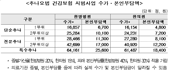 이에 따라 시범기관에서 건강보험 적용을 받으면 단순·전문추나는 1회에 1만 6000원~4만 3000원(본인부담 4800원~1만 7000원), 특수추나는 6만 1000원~6만 4000원(본인부담 1만 8000원~2만 6000원) 수준이 될 예정이다.