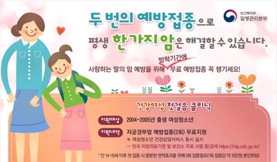 질병관리본부는 여성청소년의 자궁경부암 무료 예방접종 사업인 ‘건강여성 첫걸음 클리닉’을 올해에도 지속한다며 새 학년 시작 전 봄방학을 이용해 예방접종을 받을 것을 8일 당부했다.