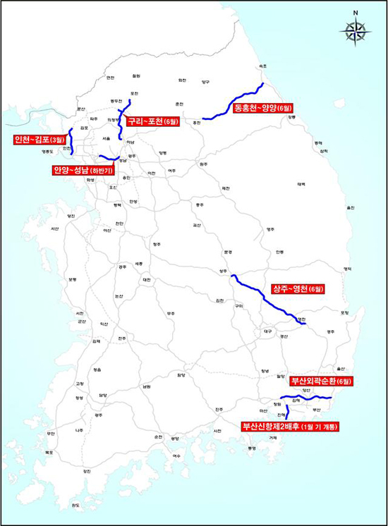올해 연말까지 개통되는 도로 사업을 유형별로 보면 동홍천~양양(6월), 부산외곽순환고속도로(12월) 등 재정고속도로 2개 노선과 인천~김포(3월), 안양~성남(하반기) 등 민자고속도로 5개 노선이 개통된다.