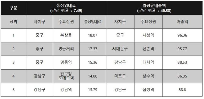 서울시내 주요 상권 통상임대료 ㎡당 74,900원…상가임대차 실태조사 발표