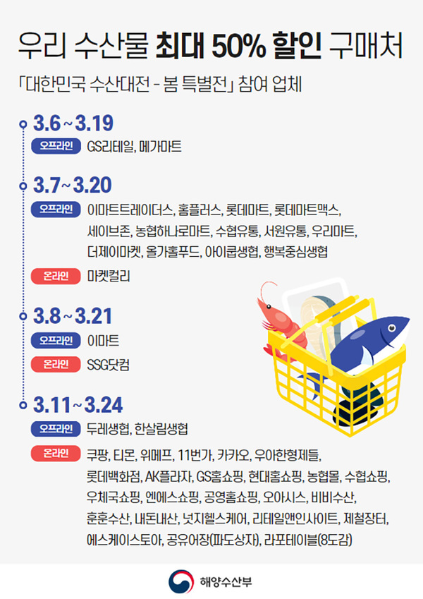 봄 특별전에는 마트 18곳과 온라인몰 27곳이 참여한다. 관련된 자세한 내용은 대한민국 수산대전 공식 누리집(www.fsale.kr)에서 확인할 수 있다.