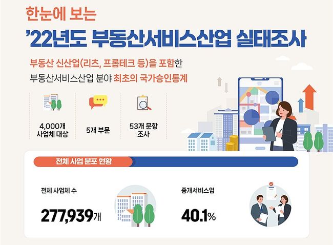 국토교통부는 전국에서 부동산서비스산업을 영위하고 있는 표본 4천 개의 사업체를 대상으로 조사한 2022년도 부동산서비스산업 실태조사 결과를 공표했다.