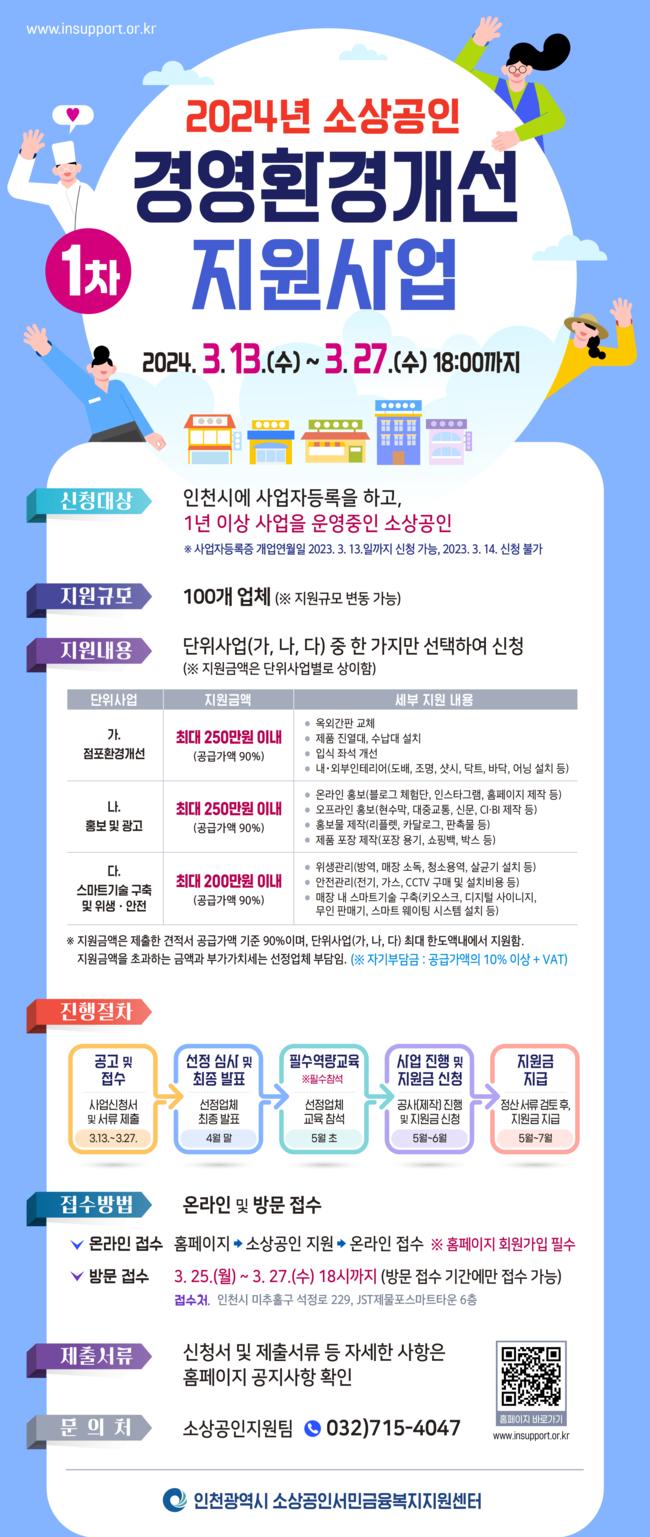 인천광역시는 3월 13일(수)부터 3월 27일(수)까지 소상공인 경영환경개선사업 대상자를 모집한다고 밝혔다.