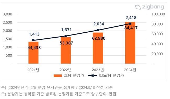 직방이 2024년 1~2월 공급된 전국 분양 단지의 분양가를 분석한 결과 3.3㎡당 분양가는 2,418만원으로 지난 해 (2,034만원/3.3㎡)에 비해 19%가량 높은 것으로 집계됐다.