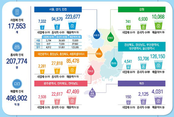 ▲ 지역별 물산업 사업체 현황이번 조사 결과를 보면 물산업 사업체 수를 비롯해 물산업 매출액과 수출액 등이 전년 대비 증가세를 지속하고 있어 전반적인 물산업의 성장흐름은 양호한 것으로 나타났다.