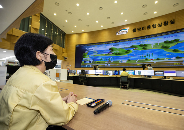 ▲ 한화진 환경부 장관이 대전 대덕구 한국수자원공사 물관리종합상황실에서 물관리시스템을 점검하고 있다. (ⓒ뉴스1) 2022년도 기준 물산업 사업체 수는 전년도 1만 7283개보다 약 1.6% 증가한 1만 7553개로 나타났다.