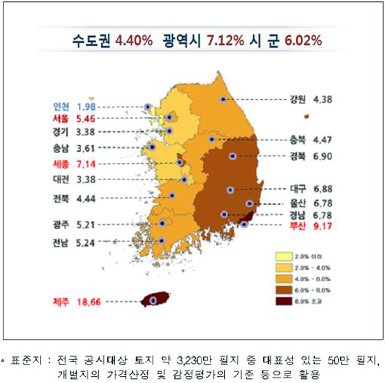 광역시 및 시·군 지역은 제주(18.66%), 부산(9.17%), 세종(7.14%), 대구(6.88%) 등이 높은 상승률을 보였는데 이는 일부지역의 개발사업 진행에 따른 토지수요 증가 등이 주요 요인으로 보인다.