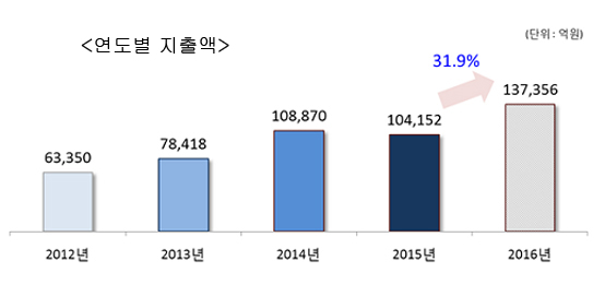 이번 발표에 따르면, 지난해 외국인이 국내에서 사용한 신용카드의 총지출액은 13조 7000억 원으로 2015년 10조 4000억 원 대비 32%, 2014년 10조 9000억 원 대비 26%가 각각 증가했다. 이는 2015년 ‘중동호흡기증후군(메르스) 사태’의 기저효과가 반영된 것이다.